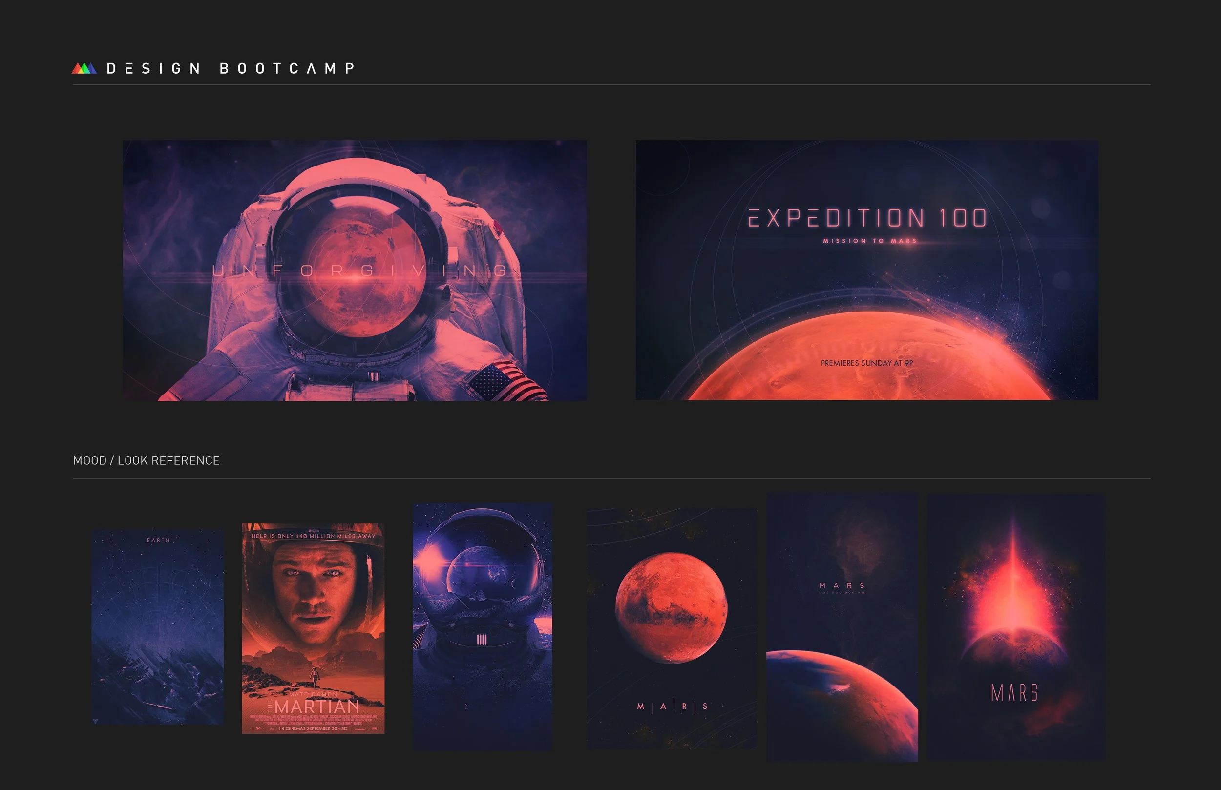 The brief: In the same vein as Expedition 44, we’re working on a show for a future mission to Mars. The show is called Expedition 100: Mission to Mars. We’re looking for some Style Frames and (eventually) Design Boards. We want a treatment on the footage as well as design for all GFX.