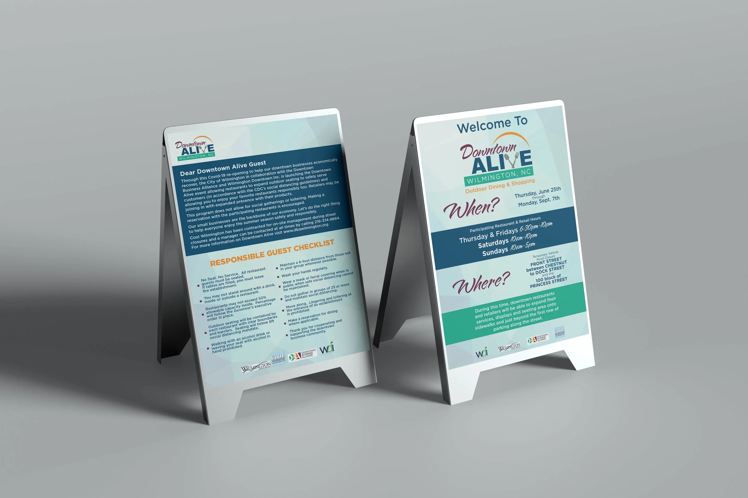 During the midst of the COVID19 shutdowns, the Downtown Business Alliance (DBA) asked out for volunteers to help market an initiative to get people back to enjoying their favorite restaurants and coffee shops. As a downtown resident and a frequent visitor of many of the restaurants that had been negatively affected by the shutdown, I immediately reached out to offer my services. Working closely with the Joan Loch at the DBA, I created a logo to use on print and digital materials. The initiative involved closing specific streets for traffic, and extending restaurant seating into the street. To facilitate on-site communication, I also created street signage, including signs for light poles, A-frames, and window decals.